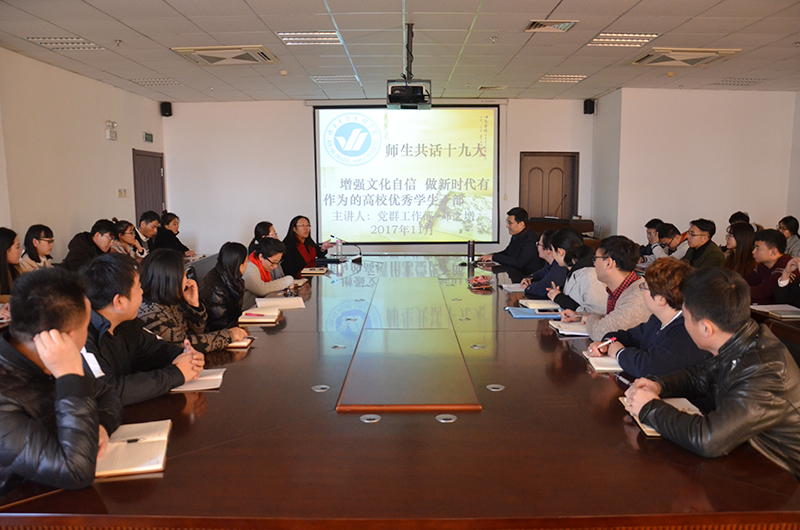 经济系党支部副书记邓之增作专题报告。他围绕十九大报告中的国家定位、建设成就、思想旗帜、政策方针等几部分进行详细解读,并针对报告中提出的“坚定文化自信”作深入探讨。他讲到,“文化根、民族魂、中国梦”是文化自信的内涵,大学生要加深对中华文化发展历程、优秀文化组成以及民族精神的了解,不断提高自己的民族情怀。要努力净化中国文化发展环境,加大宣传中华文化力度,通过学校教育、理论研究、历史研究等方式影响广大团员青年树立正确的历史观、民族观、国家观和文化观,增强文化自信的勇气和底气;通过学习经典书目,组建社会实践队、开展文化竞赛、社团文化活动等形式践行社会主义核心价值观。随后,外语系团总支书记温少斐以及学生代表围绕学习党的十九大精神交流自己的心得体会。