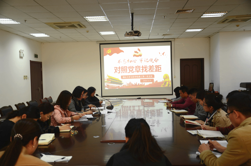 11月5日下午,中国共产党烟台大学文经学院教工第二支部在二教六楼会议室召开全体党员“不忘初心 牢记使命”对照党章找差距专题会,并学习传达了十九届四中全会会议精神。党委副书记李荣梅作为普通党员出席,会议由支部组织委员臧延云主持。