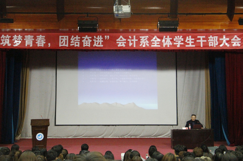 为进一步提升学生干部的能力和素质,11月22日中午,会计系于一教多功能厅举办了“不忘初心、牢记使命”主题教育系列活动之学生干部培训会,此次会议由会计系党总支书记张仁杰主讲,会计系党总支副书记赵蓓,辅导员纪靖欣、林蕾、田坤、王艺橙以及会计系全体学生干部参加了此次大会。