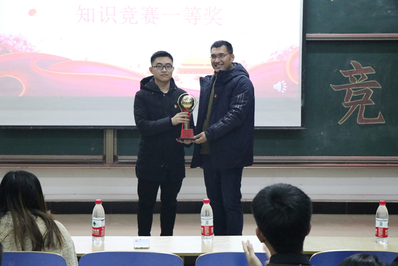 本次竞赛内容涵盖习近平新时代中国特色社会主义理论思想、党的十九大报告、党章党规等理论知识,充分检验了学生党员在“学习强国”平台上的学习成果以及党性修养。竞赛分为必答题、抢答题以及风险题三个环节,以党小组为单位参赛。比赛过程中,双方选手精神饱满,对答如流,比赛现场气氛热烈,扣人心弦,参赛党员用所学党的理论知识为现场观众上了一堂生动的党课。经过三轮角逐,最终第一党小组摘得桂冠,李季、徐成涛获“优秀个人”荣誉称号,王一鸣、刘婷、肖家欣、王浩然被评为“学习达人”。