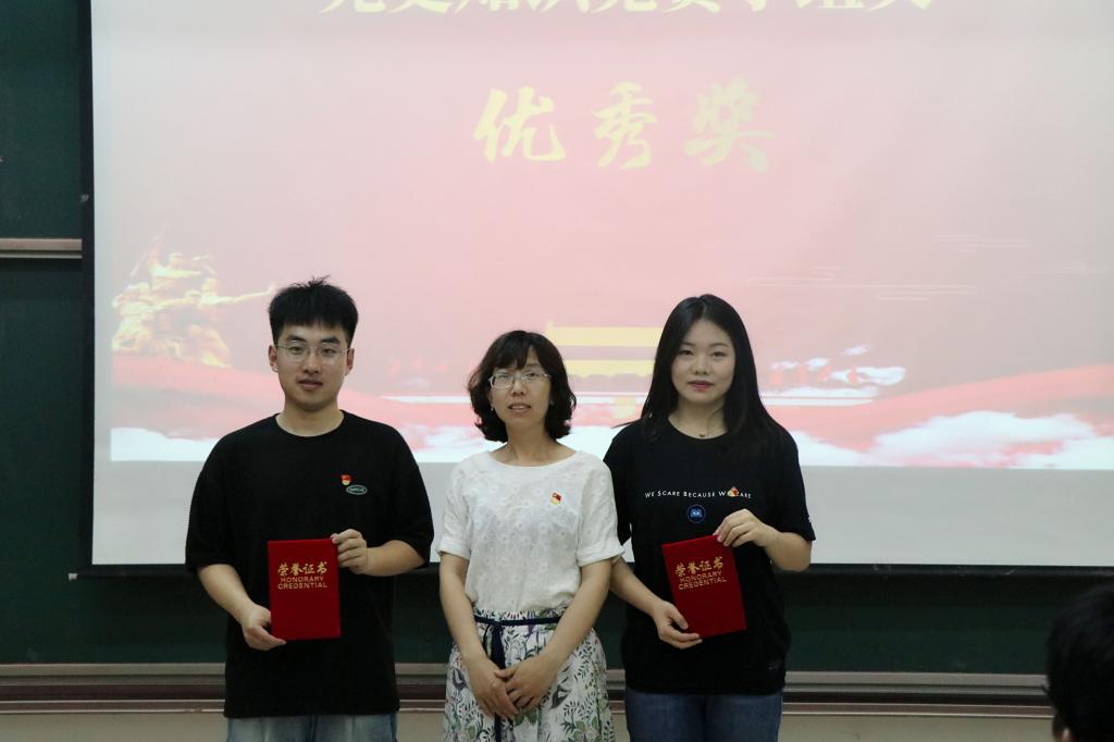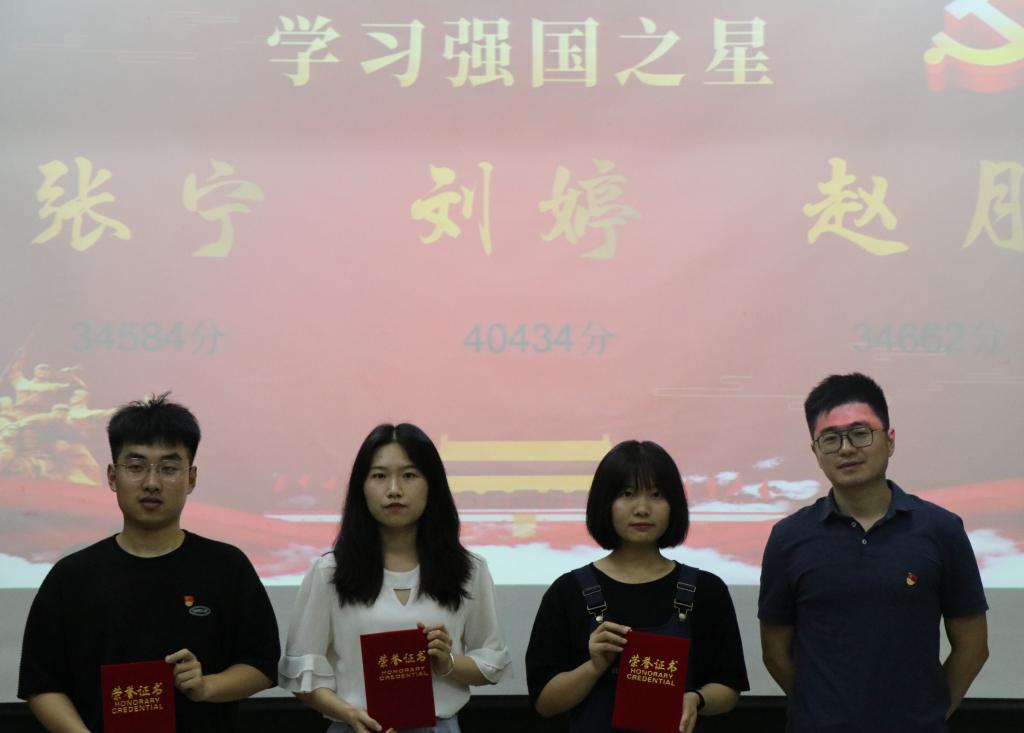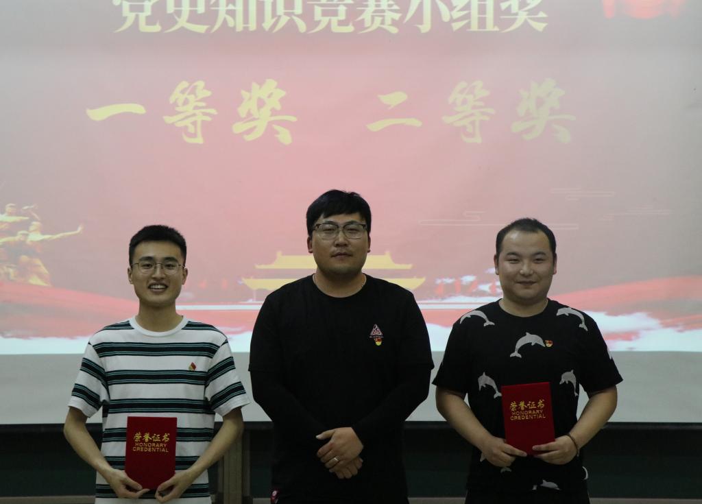 本次竞赛内容涵盖了党史、党规、党章等理论知识,共分为必答题、抢答题、风险题三个环节,参赛的四个小组分别由张宁、胡海旭、周梦娟、文广宇四位党员带队。竞赛现场参赛队员们冷静思考,沉稳答题,现场的气氛紧张而又热烈,各位同学凭借丰富的知识储备各自答出所选题目,充分展现党员的政治素养和扎实的理论基础。经过激烈的角逐,二组荣获一等奖,四组荣获二等奖,一组、三组荣获优秀奖,刘婷、赵月、张宁三名同学被评为“学习强国”之星。活动最后,全体党员们一起认真观看“建党百年,初心未变”视频,回望了党带领全国人民砥砺奋斗的伟大历史征程。