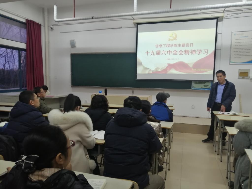 为全面贯彻习近平新时代中国特色社会主义思想,从党的百年奋斗的重大成就和历史经验中汲取智慧力量,更好的用十九届六中全会精神统一思想、统一行动,坚定信心,凝心聚力。12月2日下午,信息工程学院于一教218组织全体教职工集中学习十九届六中全会内容。会议由信息工程学院党总支副书记王明印老师主持,信息工程学院院长宋宜斌老师及全体教职工到场参加学习。