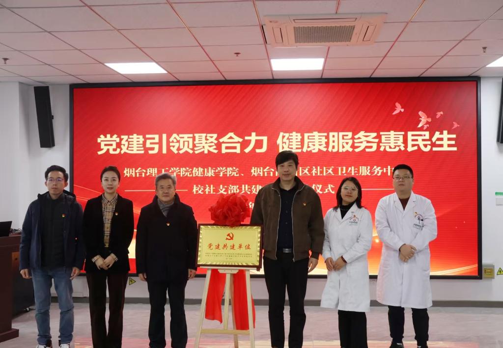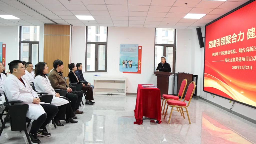 为深入学习贯彻党的二十届四中全会精神,扎实推进健康中国战略落地见效,11月27日,烟台理工学院健康学院党总支书记刘大华、团总支书记董瀚文、辅导员苏子轩一行赴烟台高新区社区卫生服务中心,参加烟台理工学院健康学院学生党支部与烟台高新区社区卫生服务中心党支部“党建引领聚合力 健康服务惠民生”校社支部共建项目启动仪式。烟台高新区社区卫生服务中心党支部书记、主任钱峰,副主任王爱景、俞军庭等领导出席仪式,双方代表、学生党员及志愿者共同参与活动。